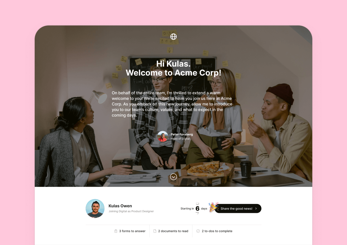 Give new hires the best start. Onboard your future colleagues in Teamtailor and deliver a smooth and confident experience from day one.