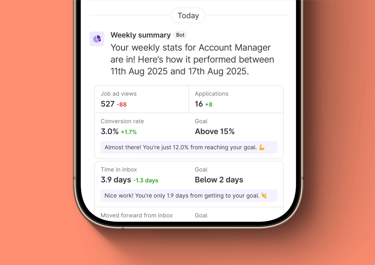 Celebrate your team’s impact. Get instant clarity on every hire, message, and interview. See what’s working, uncover opportunities to improve, and keep moving forward together.